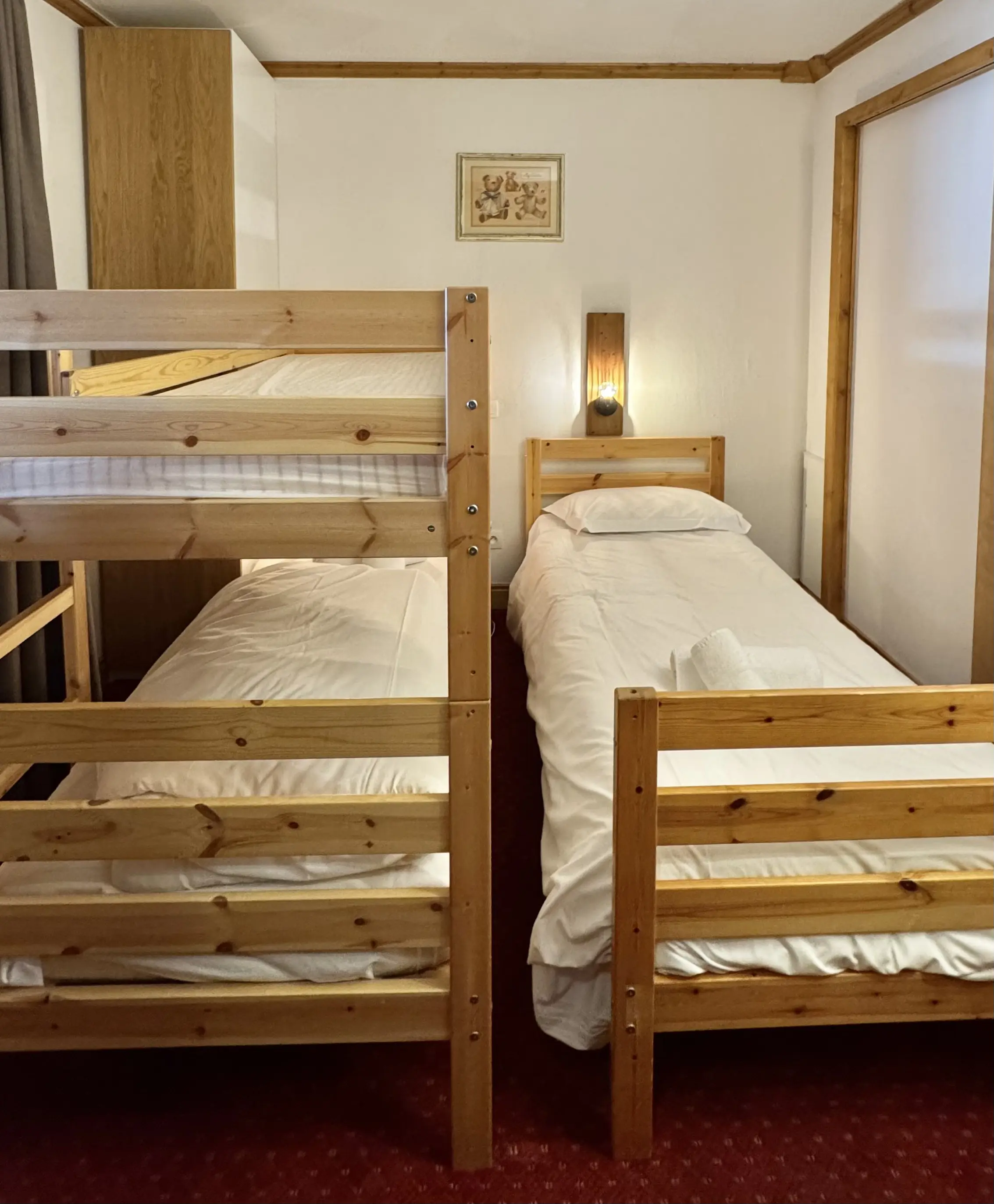 La deuxième chambre, située près de l'entrée de l'appartement est équipée de trois lits simples dont un superposé. Le lits sont garni d'une couette. La chambre est attenante à une salle de douche.
