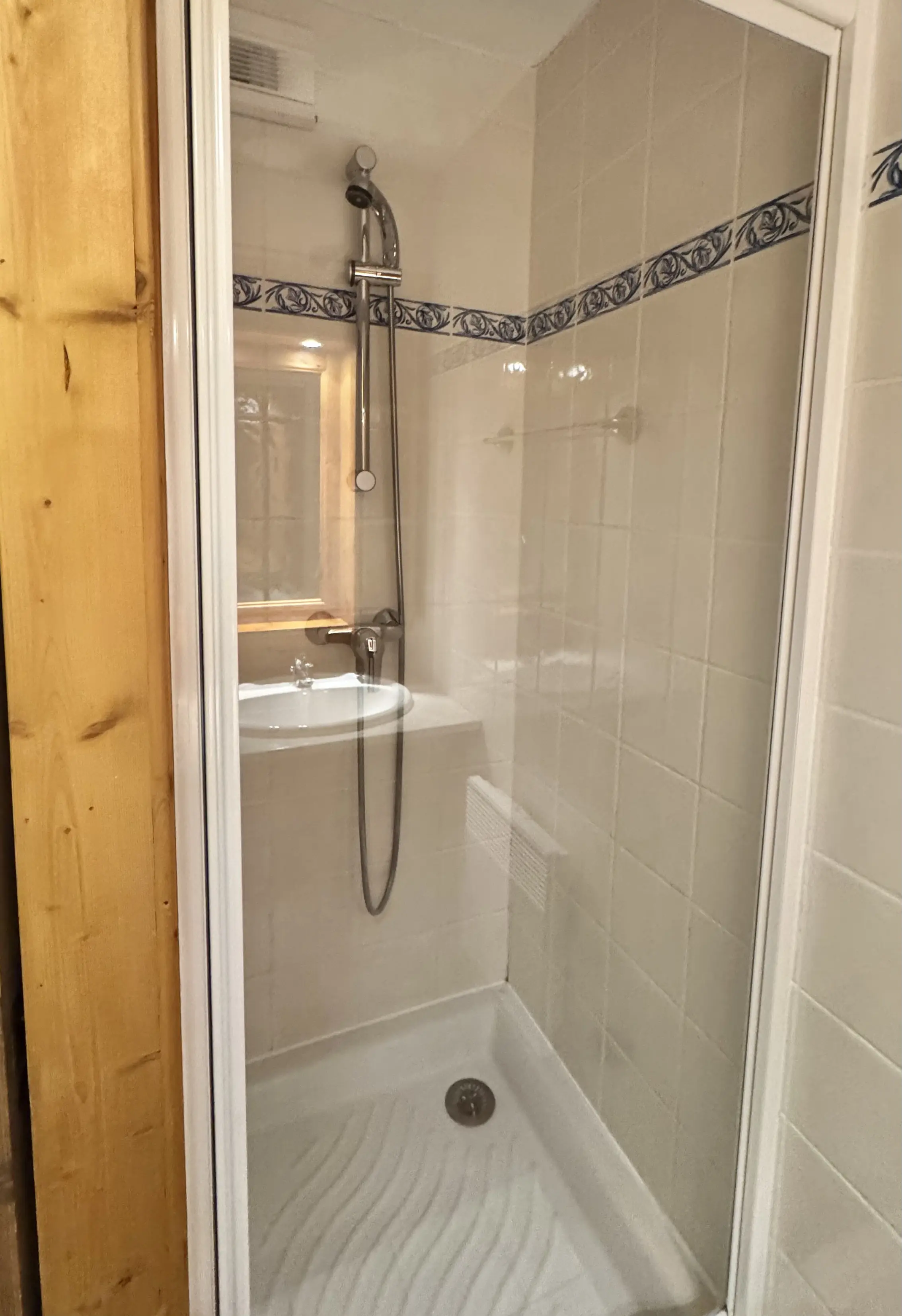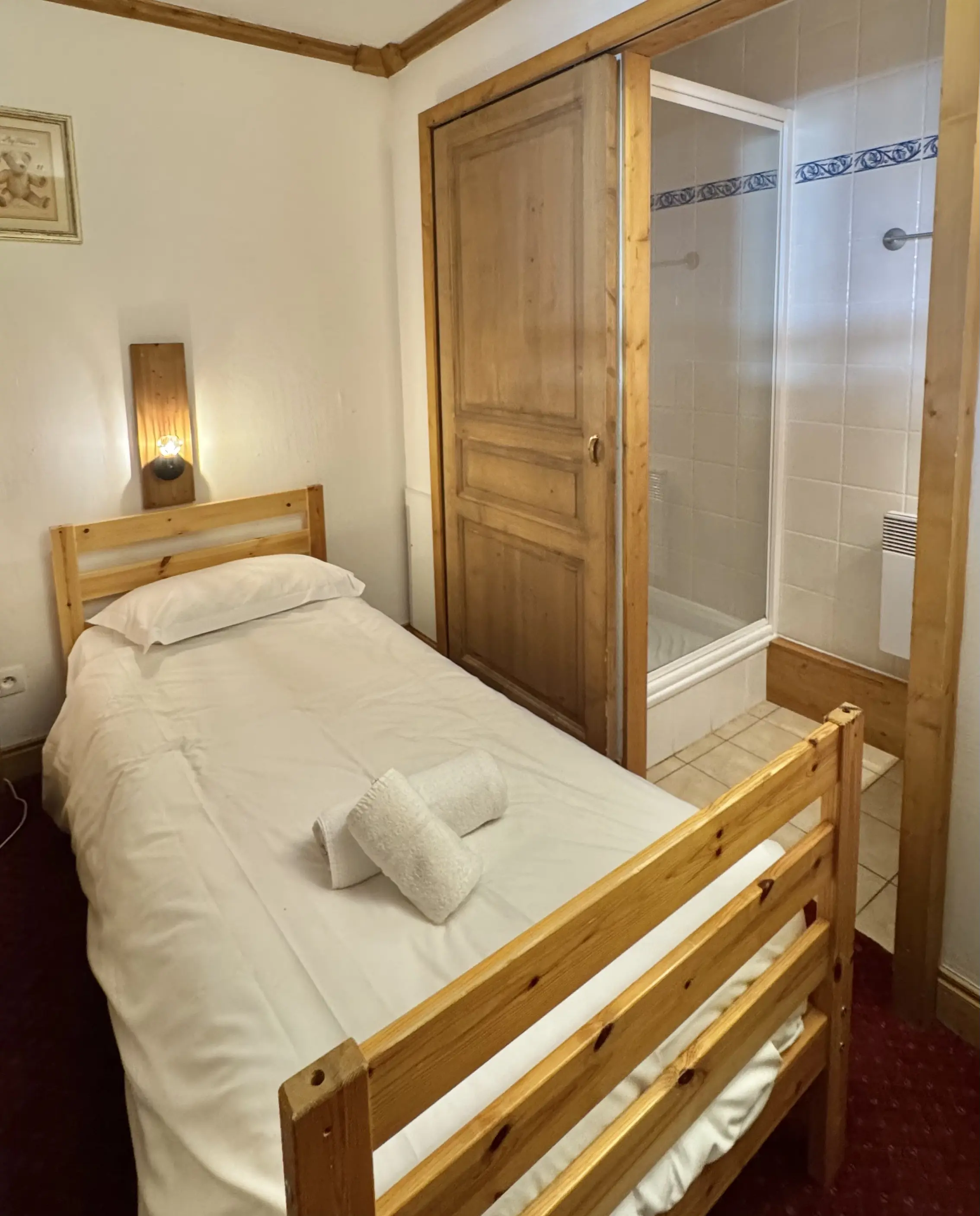 La deuxième chambre, située près de l'entrée de l'appartement est équipée de trois lits simples dont un superposé. Le lits sont garni d'une couette. La chambre est attenante à une salle de douche.
